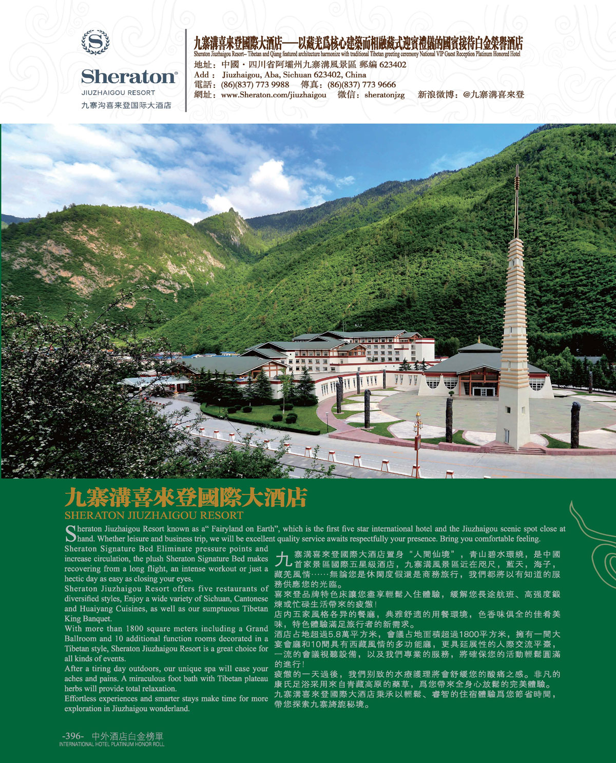 中外酒店十一届白金奖“国宾接待白金荣誉酒店”九寨沟喜来登国际大酒店!