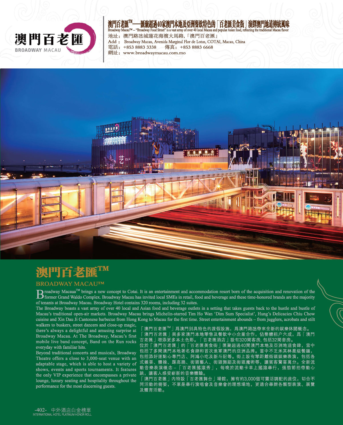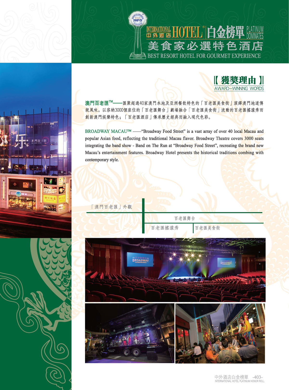 中外酒店十一届白金奖“美食家必选特色酒店”澳门百老汇!