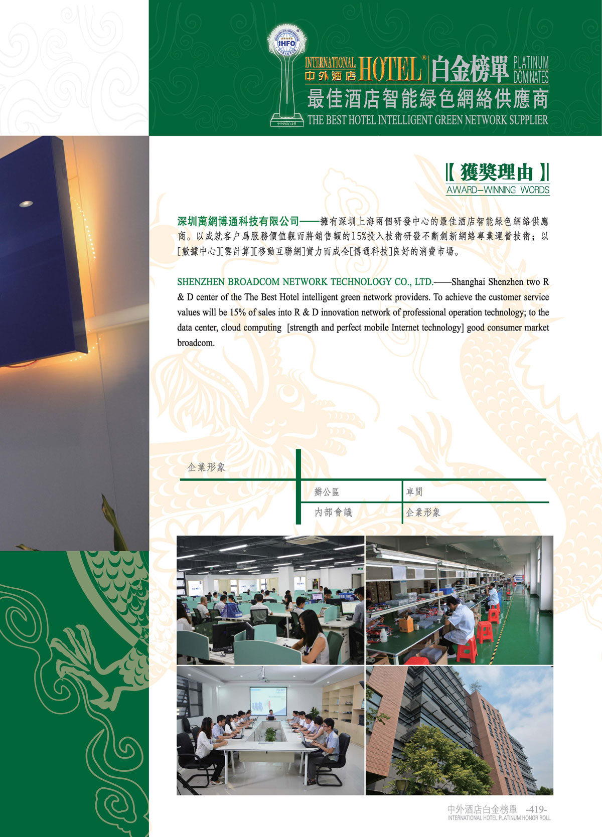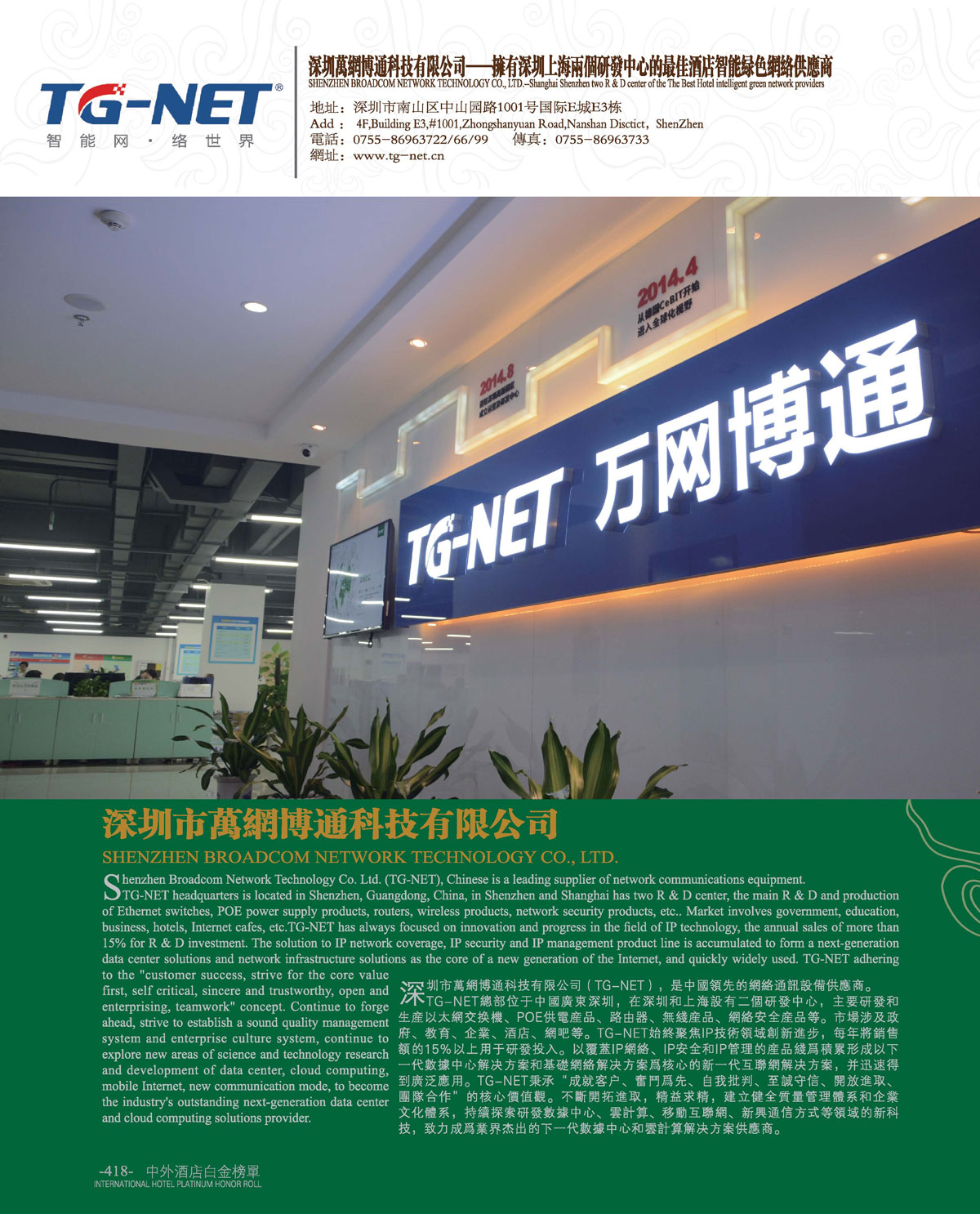 中外酒店十一届白金奖“最佳酒店智能绿色网络供应商”深圳万网博通科技有限公司!