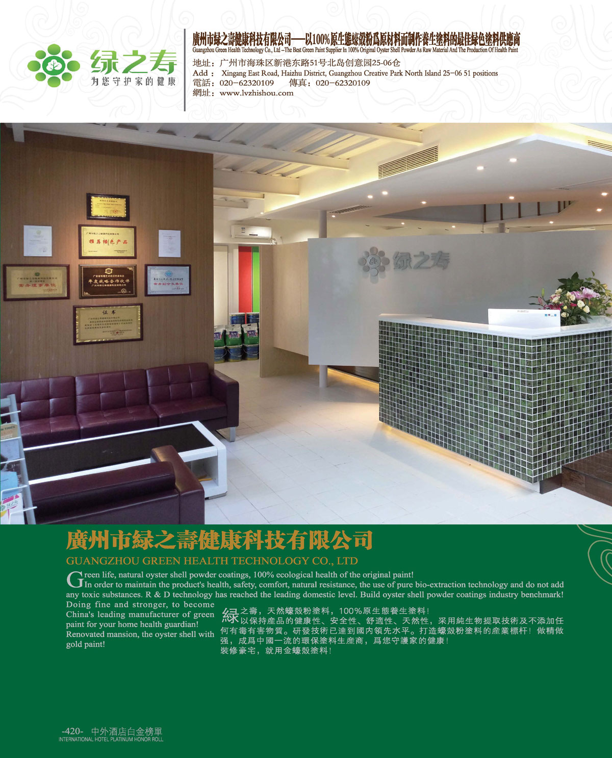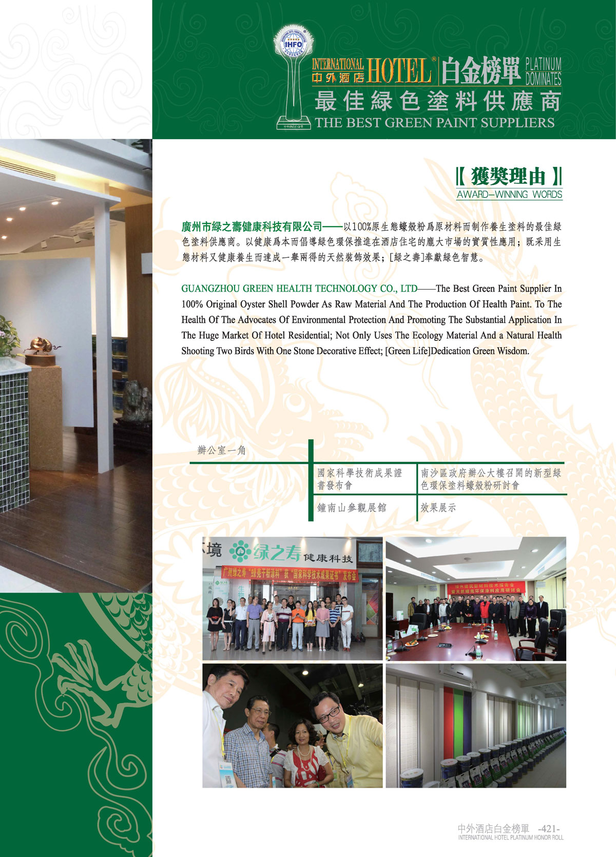 中外酒店十一届白金奖“最佳绿色涂料供应商”广州绿之寿健康科技有限公司!