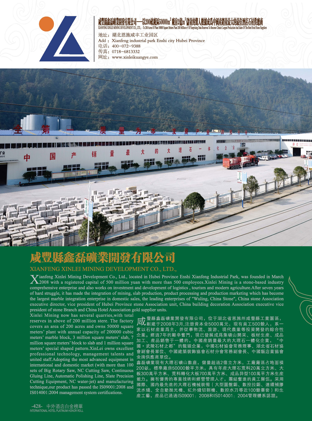中外酒店十一届白金奖“中国高端酒店最佳石材供应商”咸丰县鑫磊矿业开发有限公司!