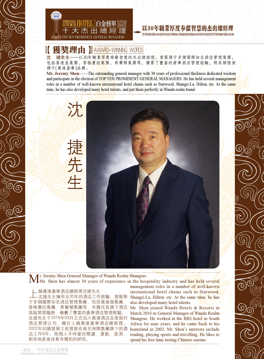 中外酒店十二届白金奖“十大杰出总经理”沈 捷!